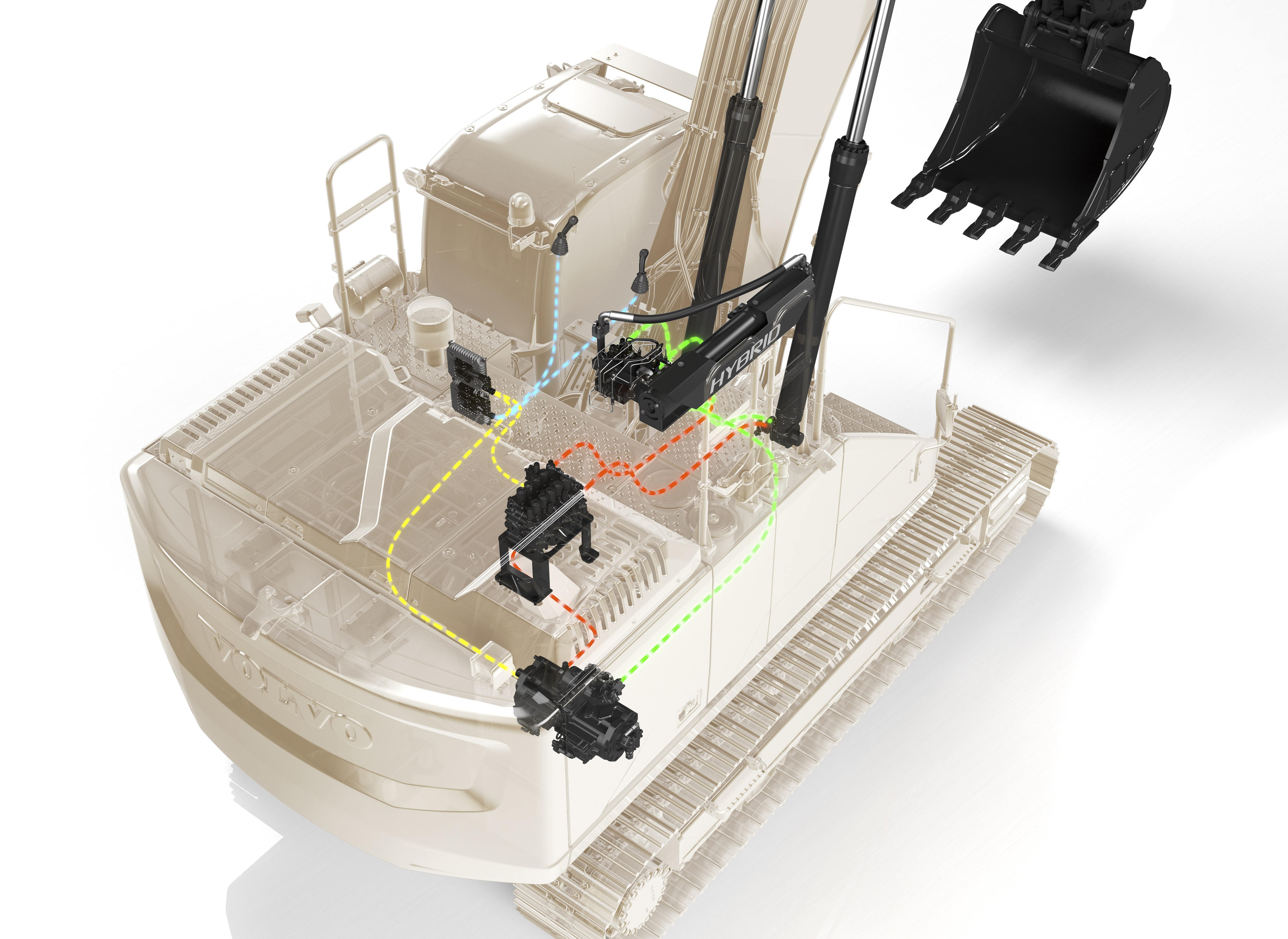 The forthcoming EC300E Hybrid excavator’s boom-down motion charges energy-storing accumulators that are used to power the hydraulic pump.
